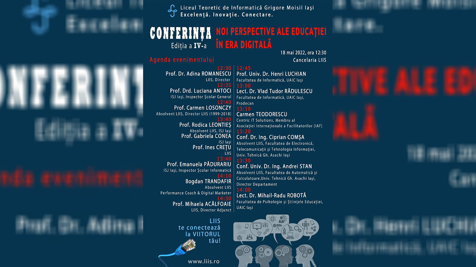„Am dedicat, anul acesta, a IV-a ediție a conferinței Noi perspective ale educației în era digitală absolvenților noștri, evidențiind modul în care se conectează la Liceul Teoretic de Informatică «Grigore Moisil» Iași, apreciind dascălii din cancelaria de ieri, trimițând constant feedback și prețuire pentru colegii mei minunați. La Liceul Teoretic de Informatică «Grigore Moisil» Iași avem profesori inspiraționali, adevărați profesioniști, dedicați elevilor și interesați să le schimbe destinul în bine, să îi ajute să devină caractere puternice și valoroase pentru comunitate. Elevilor noștri deosebit de inteligenți, care ne-au devenit parteneri în această provocare de a dezvolta o educație digitală modernă, inovativă și foarte aproape de oameni le doresc să își îndeplinească visele, să ofere în continuare frumusețea sufletului celor din jur și să se înconjoare de oameni minunați!”, a menționat prof. dr. Adina Romanescu, directorul Liceului Teoretic de Informatică „Grigore Moisil” Iași.